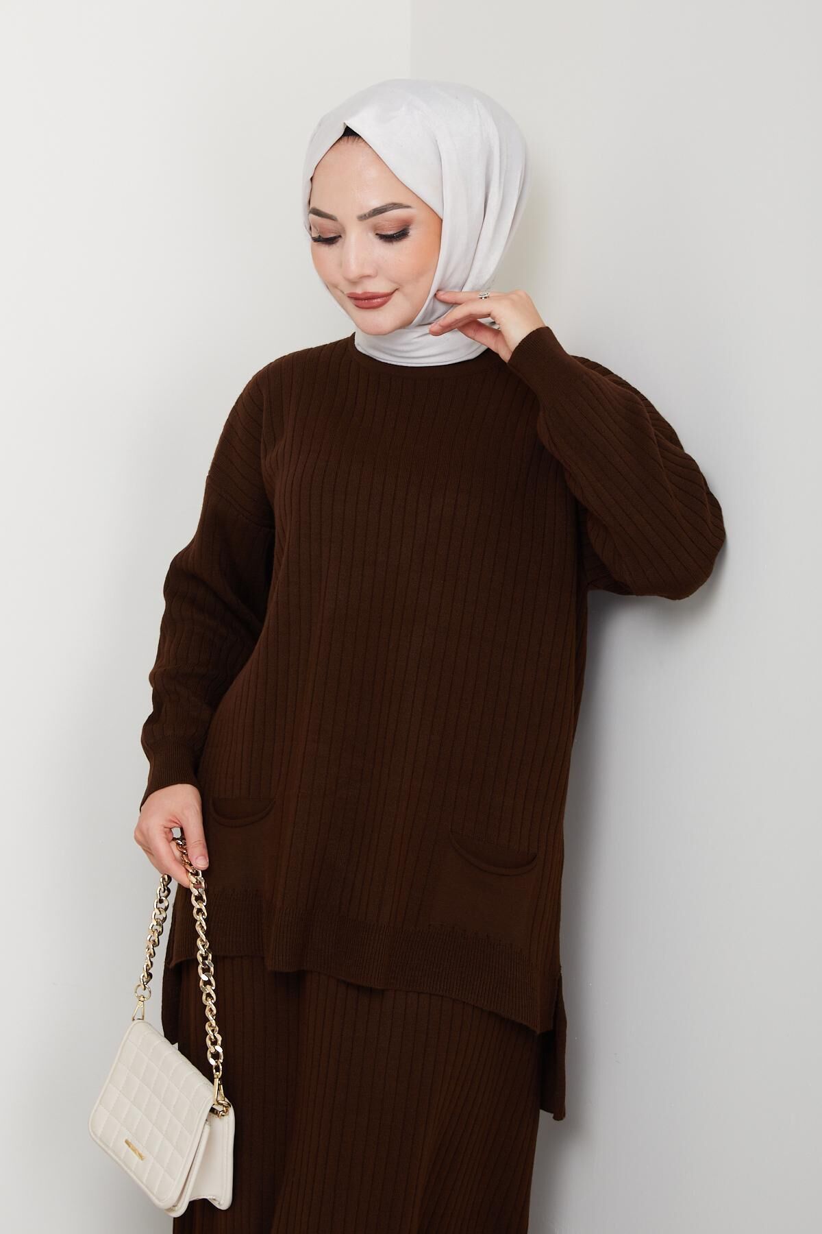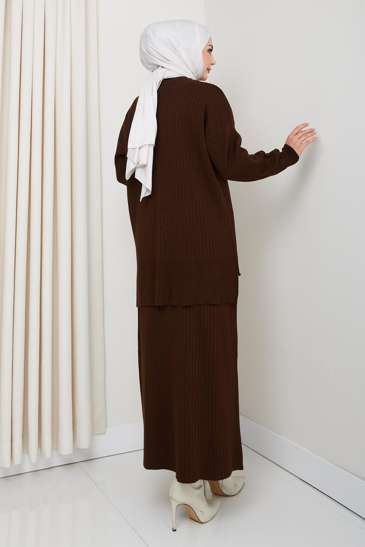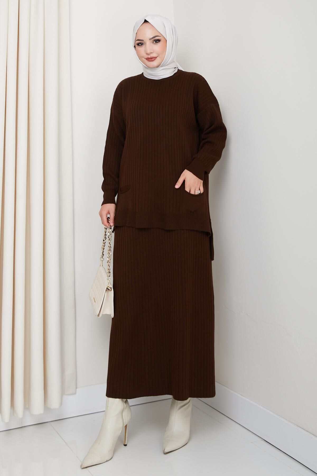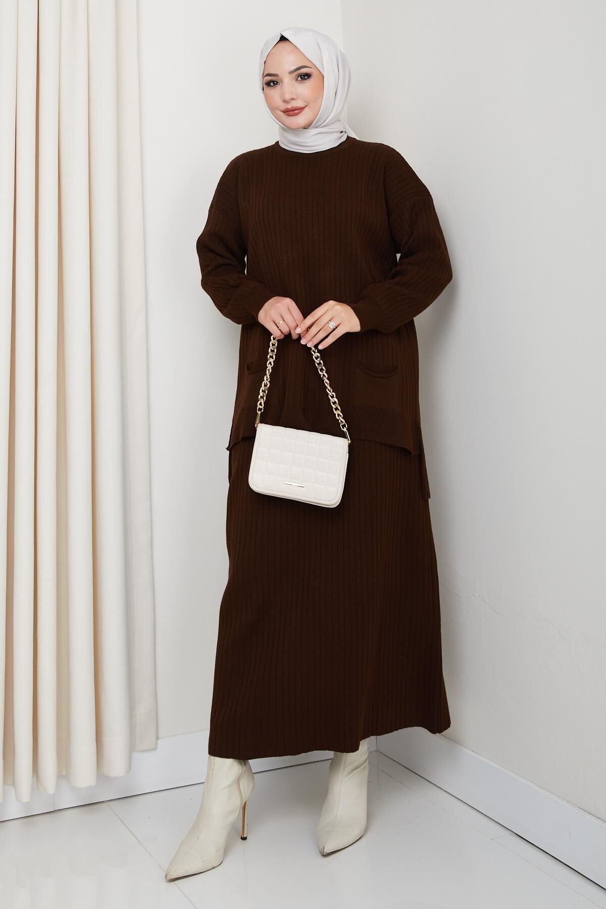- Kış aylarında sıcak tutan, çizgili deseniyle şıklığı ve rahatlığı bir arada sunan triko tunik etek takımı.; - Standart kol tasarımı ile gün boyu konforlu kullanım sağlar; hareket özgürlüğünüzü kısıtlamaz.; - Lastikli bel yapısı sayesinde vücut hatlarınıza mükemmel uyum sağlayarak rahat bir oturuş sunar.; - Cool & comfort persona ile günlük kullanımda hem stil sahibi hem de pratik bir seçenek oluşturur.; - Çift cepli tasarımı küçük eşyalarınız için kolay erişim imkanı tanırken şık görünümünden ödün vermez.; - 2'li paket içeriğiyle hem tunik hem de eteği tek seferde almanın avantajını yaşatır.; - Bisiklet yakası sayesinde modern ve zarif bir siluet çizerken soğuk havalarda boynunuzu korur.; - Uzun boy kesimi ile bacaklarınızı olduğundan daha uzun gösterir ve kışlık kombinlerinizde ideal bir tamamlayıcıdır.; - Triko kumaşı yumuşak dokusuyla cildinize nazikçe dokunurken dayanıklılığıyla uzun süreli kullanım vaad eder.; - TR menşeli olup yerel üretimden gelen kaliteyi yansıtır; Türk malı olduğu için gururla giyebilirsiniz.; - Regular kalıp ile her bedene uygun standart ölçülerde üretilmiştir; vücut hatlarınıza göre ayarlama yapmanıza gerek kalmadan rahatça giyebilirsiniz.; - Orta kalınlığa sahip olması mevsim geçişlerinde ideal sıcaklık dengesi sağlarken katmanlı giyime olanak tanır.; - Alt-üst takım olarak tasarlanmıştır; tunik ve etek kombiniyle bütüncül bir görünüm elde edersiniz.; - Regular paça tipiyle modern ve zamansız bir tarz sergilerken farklı ayakkabı tercihlerine uyum sağlar.; - Çelik örgü dokumasıyla dayanıklılık kazandırılmış bu parça, sık yıkamalara karşı direnç gösterir.
