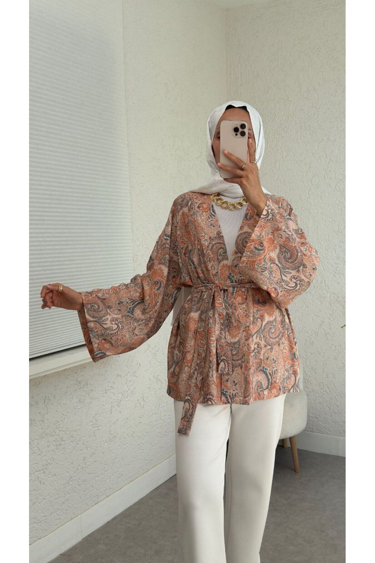 - Etnik desenleriyle dikkat çeken bu kimono, günlük kullanımda şıklığınızı tamamlar.; - Rahat kesimi sayesinde gün boyu konfor sunan bu parça, hareket özgürlüğünüzü kısıtlamaz.; - Bağlamalı tasarımı ile kolayca ayarlama imkanı sağlayarak kişisel zevkinize göre şekillendirme yapmanızı mümkün kılar.; - Her mevsime uygun olan bu kimono, farklı hava koşullarında rahatlıkla tercih edilebilir.; - V yaka detayı ile feminen çizgiler taşıyan tasarım, zarif bir görünüm kazandırır.; - Tesettür giyim koleksiyonuna özel olarak tasarlanmış olup, modern ve şık bir alternatif sunar.; - Uzun kollu yapısıyla mevsim geçişlerinde ideal koruma sağlarken, orta siluetiyle vücut hatlarınıza uyumlu bir duruş sergiler.; - Pamuk polyester karışımından üretilmiş kumaşı sayesinde nefes alabilirlik özelliği ön plana çıkarken dayanıklılığından ödün vermez.; - Günlük kullanım için ideal olan bu kimono, casual tarzınıza eşsiz bir dokunuş ekler.