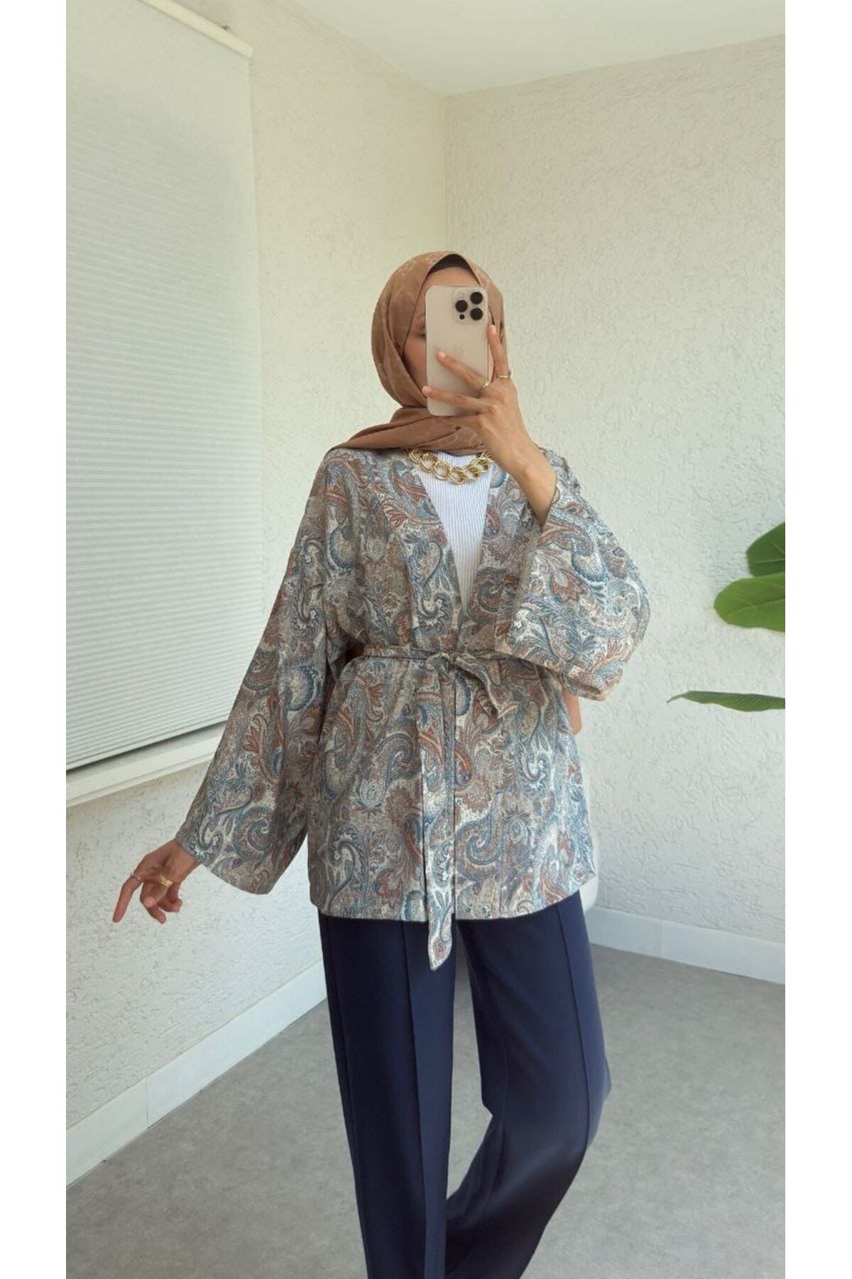 - Etnik desenleriyle dikkat çeken bu kimono, günlük kullanımda şıklığınızı tamamlar.; - Rahat kesimi sayesinde gün boyu konfor sunan bu parça, hareket özgürlüğünüzü kısıtlamaz.; - Bağlamalı tasarımı ile kolayca ayarlama imkanı sağlayarak kişisel zevkinize göre şekillendirme yapmanızı mümkün kılar.; - Her mevsime uygun olan bu kimono, farklı hava koşullarında rahatlıkla tercih edilebilir.; - V yaka detayı ile feminen çizgiler taşıyan tasarım, zarif bir görünüm kazandırır.; - Tesettür giyim koleksiyonuna özel olarak tasarlanmış olup, modern ve şık bir alternatif sunar.; - Uzun kollu yapısıyla mevsim geçişlerinde ideal koruma sağlarken, orta siluetiyle vücut hatlarınıza uyumlu bir duruş sergiler.; - Pamuk polyester karışımından üretilmiş kumaşı sayesinde nefes alabilirlik özelliği ön plana çıkarken dayanıklılığından ödün vermez.; - Günlük kullanım için ideal olan bu kimono, casual tarzınıza eşsiz bir dokunuş ekler.