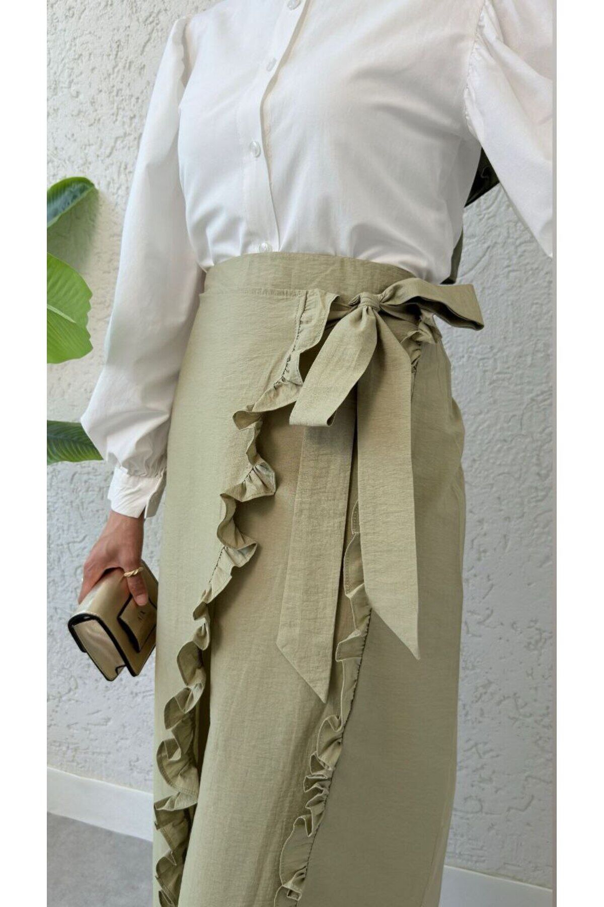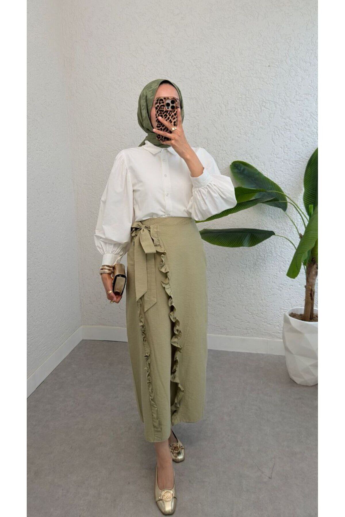 - Viskon ribana dokuma tipi ile konforlu bir kullanım sunar.; - Fırfırlı detayları ile şık ve feminen bir görünüm kazandırır.; - Tüm sezonlarda rahatlıkla tercih edilebilen çok yönlü tasarım.; - Tesettür giyim koleksiyonuna özel tasarlanmış zarif kesimiyle dikkat çeker.; - Orta kalınlıkta kumaşı sayesinde mevsim geçişlerinde ideal sıcaklık sağlar.; - Cool & comfort persona'ya hitap eden rahatlıkta tasarlanmıştır; hem gündüz hem de gece kullanımına uygundur.; - Yetişkin yaş grubuna hitap eden modern ve şık tasarım anlayışını yansıtır.; - Kuşaklı bel detayı ile vücut hatlarınıza mükemmel uyum sağlayarak feminen siluetinizi ön plana çıkarır.; - Yüksek bel tasarımı sayesinde zarif bir duruş sergilerken konforunuzdan ödün vermezsiniz.; - Astarsız yapısıyla hafif ve ferah hissettiren yapıdadır; hareket özgürlüğü sunar.; - Regular kalıp ile her bedene uygun rahatlıkta kesimi bulunur.; - Gündüzden geceye kolayca adapte olabilen düz deseniyle zamansız şıklığı yakalar.; - Düğmeli kapama şekli pratik kullanım imkanı tanırken şıklığınızdan ödün vermezsiniz.; - Pamuk polyester karışımından oluşan materyali cildinizle dost dokunuşlar sunarken dayanıklılığı arttırır.; - Uzun boy kesimiyle bacakları olduğundan daha uzun göstererek feminen çizgiler vurgular.; - TR menşeli olmasıyla yerel üretim kalitesini korurken kalite standartlarına uygunluk gösterir.; - Bel kısmındaki yüksek bel detayı modern trendleri takip ederken stil sahibi görünmenizi sağlar.; - Astarsız yapısıyla hafiflik hissi verirken konforlu kullanım sunar; gün boyu rahat etmenizi sağlar.; - Regular kalıp sayesinde her bedene uygun rahatlıkta kesimi bulunur; hareket özgürlüğünüz kısıtlanmadan şıklığınızdan ödün vermezsiniz.; - Gündüzden geceye kolayca adapte olabilen düz deseniyle zamansız şıklığı yakalar; her ortamda göz alıcı görünmenizi sağlar.; - Düğmeli kapama şekli pratik kullanım imkanı tanırken şıklığınızdan ödün vermezsiniz; zamansız parçalar arasında yerini alır.; - Pamuk polyester karışımından oluşan materyali cildinizle dost dokunuşlar sunarken dayanıklılığı arttırır; uzun süreli kullanım vaad eder.; - Uzun boy kesimiyle bacakları olduğundan daha uzun göstererek feminen çizgiler vurgular; zarif duruşunuza katkıda bulunur.; - TR menşeli olmasıyla yerel üretim kalitesini korurken kalite standartlarına uygunluk gösterir; yerel üretim avantajlarını yaşatır.; - Bel kısmındaki yüksek bel detayı modern trendleri takip ederken stil sahibi görünmenizi sağlar; trendleri yakalamanızda yardımcı olur.