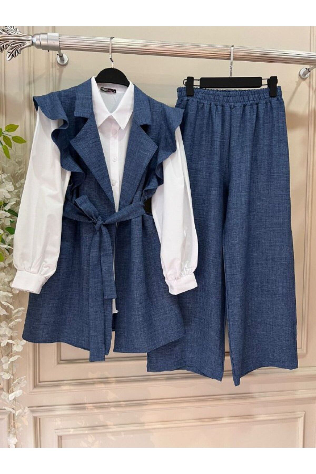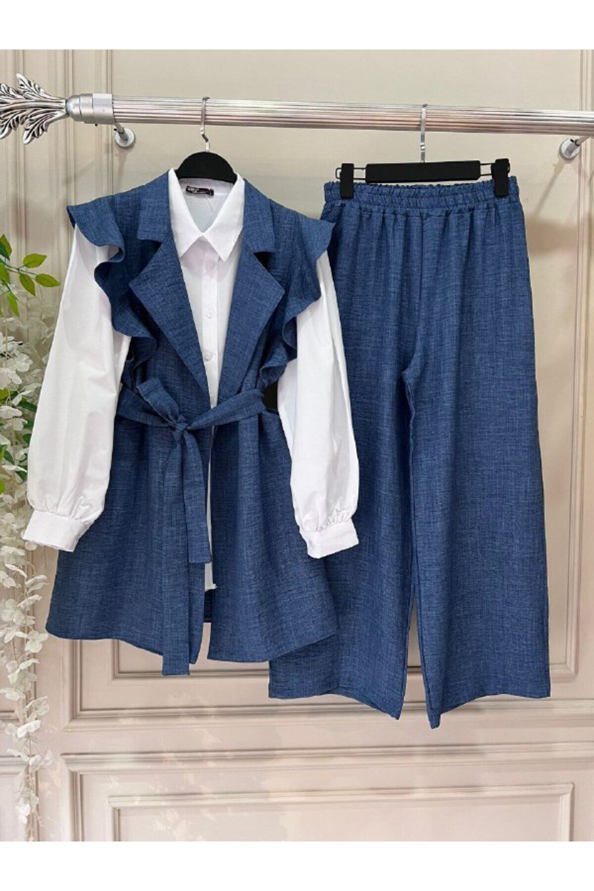 - Rahatlık ve şıklığı bir arada sunan keten gömlekli yelekli pantolonlu takım, günlük kullanımda konforlu bir deneyim sağlar.; - Bel kısmındaki lastik detayı sayesinde vücut hatlarınıza mükemmel uyum sağlayarak rahat hareket etme imkanı tanır.; - Bağlama veya bağcık özelliğiyle farklı stiller yaratma özgürlüğü sunar; böylece her ortama uygun kombinler yapabilirsiniz.; - Üç parçadan oluşan set içeriği (gömlek, yelek ve pantolon) ile hem pratiklik hem de estetik bir bütünlük elde edersiniz.; - Boru paça kesimi sayesinde modern ve zamansız bir görünüm kazandırırken, çift cepli tasarım fonksiyonellik katmaktadır.; - Düz deseniyle sadeliği ön plana çıkaran bu takım, her türlü aksesuarla kolayca eşleştirilebilir.; - Regular kalıp ve boy seçenekleriyle her bedene hitap ederek geniş bir kullanıcı kitlesine uygunluk gösterir.; - Casual giyimin vazgeçilmez parçası olan bu takım, günlük aktivitelerden özel günlerdeki şıklığa kadar geniş bir kullanım alanına sahiptir.; - Yüksek kaliteli keten materyali nefes alabilir yapıda olup yaz aylarında serin tutarken aynı zamanda dayanıklılığıyla uzun süreli kullanım vaat eder.; - Uzun kollu tasarım soğuk havalarda ekstra koruma sağlarken standart kol tipiyle rahatlık sunar.