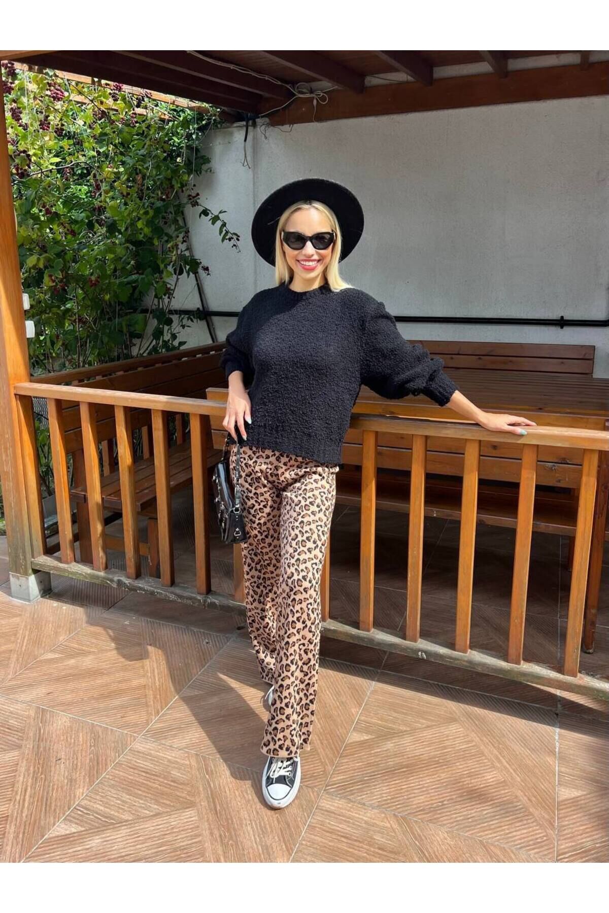 - Her yaş grubuna uygun, leopar desenli triko pantolonla stilinizi öne çıkarın.; - Uzun boy kesimiyle rahat hareket etme özgürlüğü sunar ve günlük kullanım için idealdir.; - Akrilik materyali sayesinde yumuşak dokusuyla konforlu bir deneyim sağlar.; - Geniş paça tasarımı modern ve şık bir görünüm kazandırırken, lastikli bel yapısı ile rahatlık sunar.; - Triko kumaşı, dayanıklılığı ve esnekliğiyle uzun süreli kullanım vaat eder.; - Cepsiz yapısı ile minimalist bir tarz yaratırken, leopar deseniyle göz alıcı detaylar ekler.; - Astarsız oluşuyla hafif ve nefes alabilen bir yapıya sahiptir; böylece gün boyu rahat hissedersiniz.; - Bol kalıbıyla vücudu sarmayan, özgürce hareket edebilmenizi sağlayan tasarım.