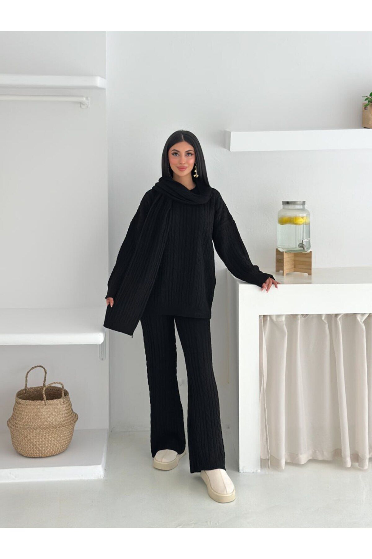 - Örgü detayları ile zenginleştirilmiş, kış aylarında sıcak tutan triko takım.; - Kalın yapısı sayesinde soğuk havalarda konforlu bir kullanım sunar.; - Günlük hayatta rahatlıkla tercih edilebilecek casual koleksiyonun parçası.; - Bisiklet yakası ile modern ve şık bir görünüm sağlar.; - Normal bel kesimiyle gün boyu rahat hareket etme imkanı tanır.; - Üç parça olarak gelen set, pratik ve şık kombinler oluşturmanıza olanak tanır.; - Kış sezonunun vazgeçilmez parçası olan geniş paça pantolon, hem sıcak tutar hem de stil sahibi görünmenizi sağlar.; - Astarsız yapısıyla hafif ve nefes alabilen bir deneyim sunar.; - Cepsiz tasarım, minimalist tarzınızı ön plana çıkarırken fonksiyonellikten ödün vermez.; - İki parçadan oluşan kazak-pantolon takımı, günlük giyiminize kolayca adapte olur.; - Triko dokusuyla yumuşak dokunuşu hissettiren bu takım, soğuk günlerde ideal konforu sunar.; - Desenli örme detaylarıyla göz alıcı bir estetik sergiler.; - Regular kalıp sayesinde vücut hatlarınıza uyum sağlayarak rahat bir oturuş sunar.; - Kadın ve kız kullanıcılar için idealdir; her yaş grubundan kadına hitap eder.; - Pamuk materyali cildinizle dosttur ve uzun süreli kullanım için uygundur.; - Gündüzden geceye geçişlerde bile şıklığınızdan ödün vermeyin; gündüzden geceye her ortamda rahatlıkla tercih edebilirsiniz.