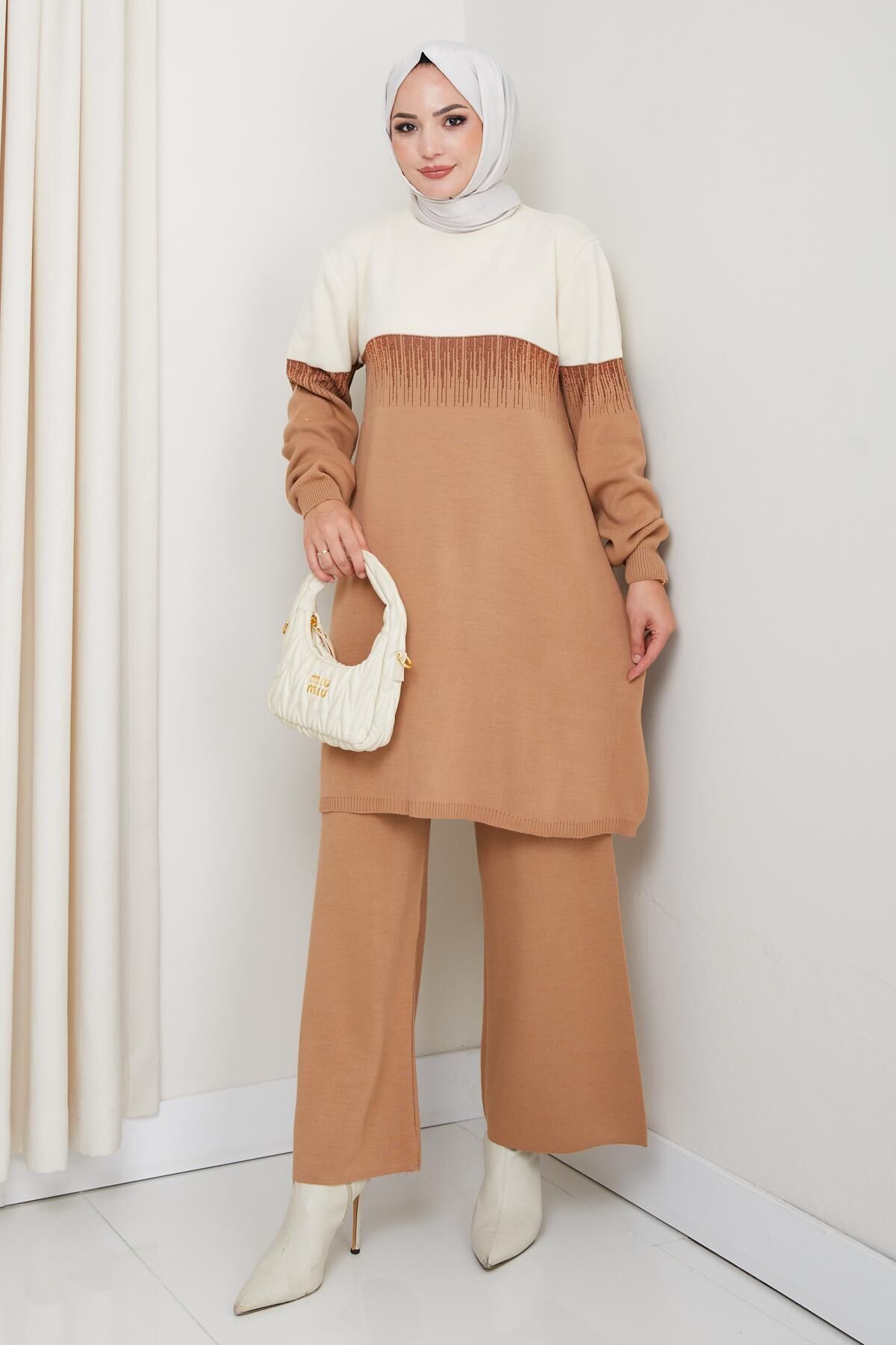 - Kış aylarında sıcak tutan, örme sim desenli triko tunik pantolon takım ile şıklığınızı koruyun.; - Rahatlık sunan lastikli bel tasarımı sayesinde gün boyu konforlu bir kullanım sağlar.; - Standart kol yapısıyla günlük aktivitelerinizde özgürce hareket etme imkanı verir.; - Astarsız yapısıyla hafif ve nefes alabilen bir yapı sunar.; - Bisiklet yakası sayesinde modern ve sade bir görünüm elde edersiniz.; - Uzun boy tasarımı ile hem rahatlık hem de stil sahibi bir duruş sergilersiniz.; - Triko kumaş tipi, yumuşak dokusuyla teninize nazikçe dokunur ve uzun süreli kullanım için idealdir.; - Türkiye menşeli olmasıyla yerel üretim avantajlarından faydalanırken kaliteli malzemeden emin olursunuz.; - Regular kalıp seçeneğiyle vücut hatlarınıza uyum sağlayarak rahat bir oturuş sunar.; - Orta kalınlıkta kumaşı mevsimsel geçişlerde ideal konforu sağlar.; - Tunikli pantolonlu alt-üst takım kombiniyle pratik ve şık bir gardırop oluşturabilirsiniz.; - Bol paça kesimi sayesinde hareket özgürlüğünüzü artırırken aynı zamanda trend bir görünüm kazandırır.; - Simli örme dokumasıyla göz alıcı detaylar ekleyerek stilinizi ön plana çıkarın.; - Günlük kullanım için ideal olan bu takım, casual giyimin vazgeçilmez parçasını sizlere sunar.; - Uzun kol boyu soğuk havalarda bile sizi sıcak tutarken zarif bir siluet çizer.