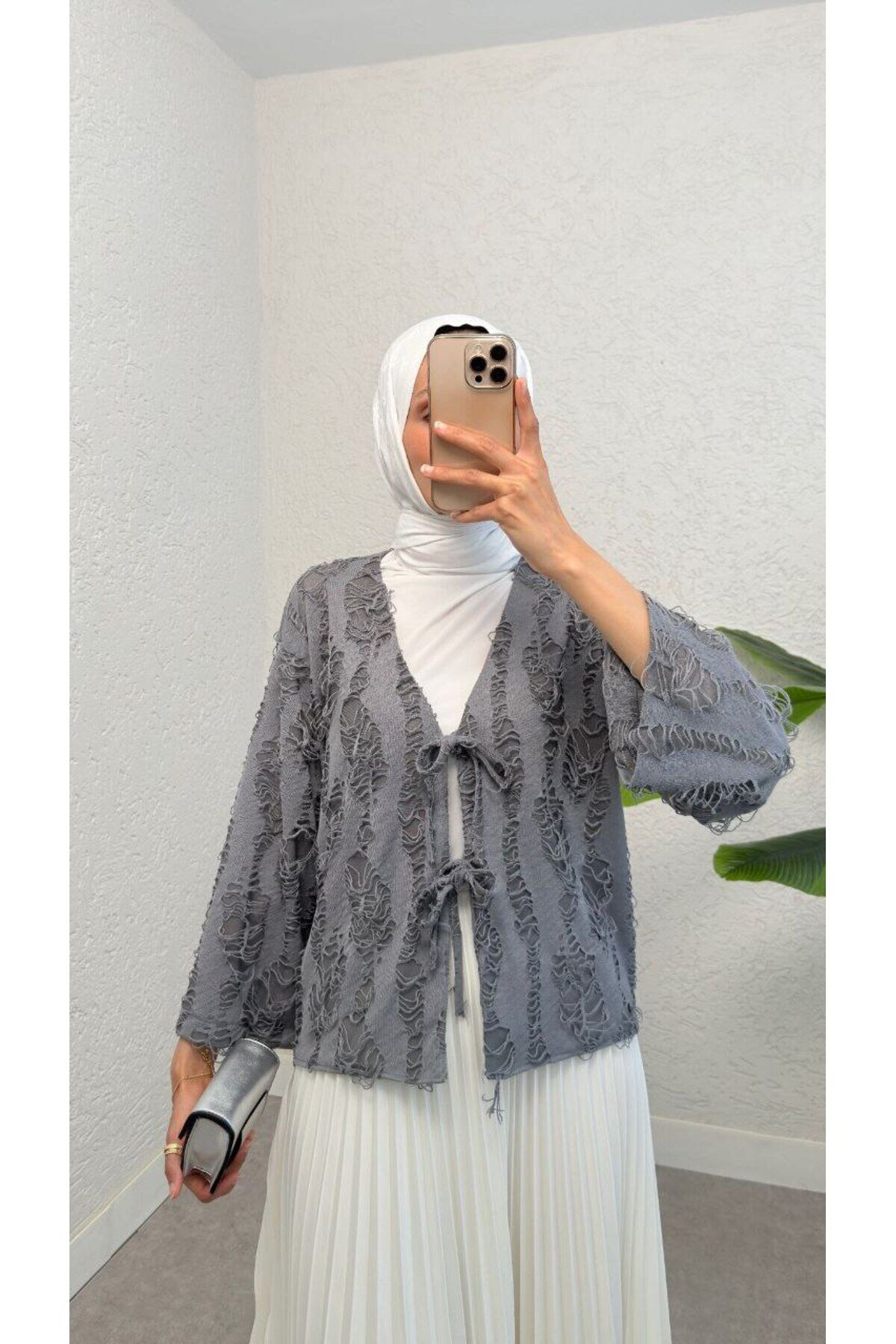 - Püskül detayları ile zenginleştirilmiş, her mevsim rahatlıkla tercih edilebilecek bir tasarım sunar.; - Uzun kollu yapısıyla mevsim geçişlerinde ideal koruma sağlar.; - Desenli tasarımı ile göz alıcı bir stil oluştururken, cool & comfort persona'ya uygun konforlu bir kullanım vaat eder.; - Bağlama özelliği sayesinde kişisel zevke göre ayarlama imkanı tanır; böylece farklı kombinasyonlar yaratılabilir.; - V yaka kesimiyle feminen çizgiler ön plana çıkarırken, kısa boyu modern ve şık bir görünüm kazandırır.; - Design koleksiyonuna ait bu kimono, özgün tasarımları sevenler için idealdir.; - Jakar dokuma tipiyle kaliteli hissiyatını arttırarak uzun süreli kullanım vaat eder.; - Dokuma kumaşı dayanıklılığı arttırarak sık yıkamalarda bile formunu korumasına yardımcı olur.; - Kısa boyu ile hareket özgürlüğü sağlarken, regular kalıp vücudu saran ancak sıkmayan yapıda konfor sunar.; - Pamuk polyester karışımından üretilmiş materyali cildinizle dosttur ve nefes alabilir özelliktedir.; - Soyut deseniyle trendleri takip edenler için mükemmel bir seçimdir.; - Günlük kullanım için uygundur; casual ortamlarda rahatlıkla tercih edilebilir.