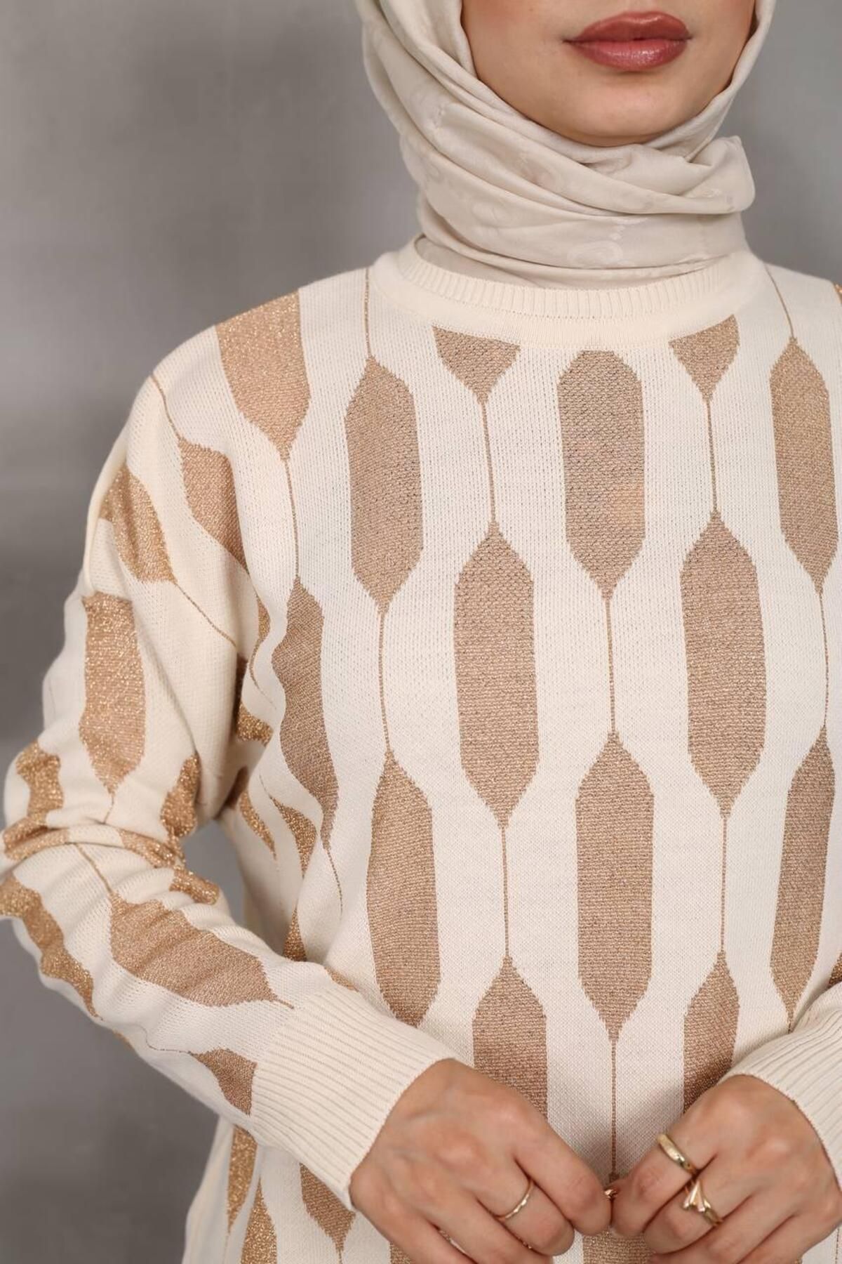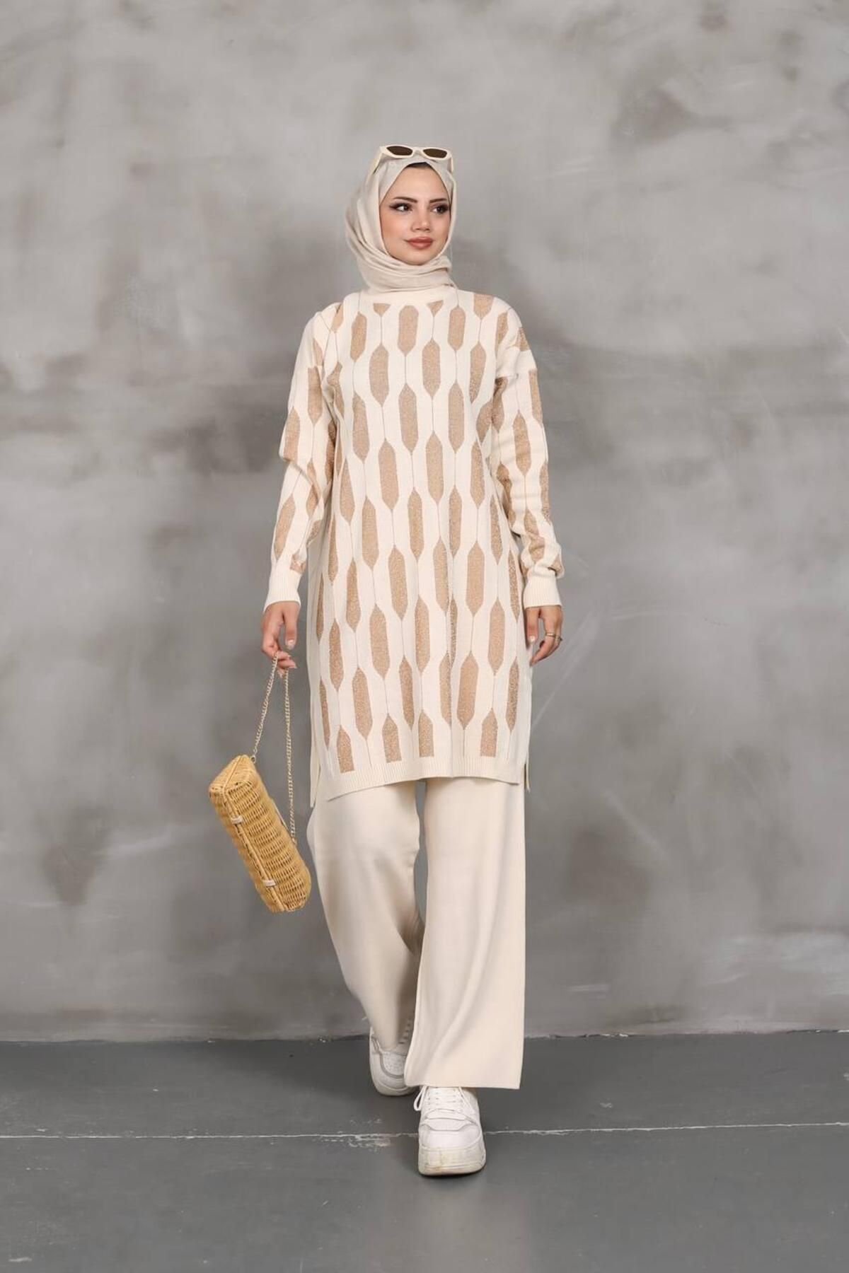 - Standart boy ve regular kalıp ile rahat bir kullanım sunar.; - ; Triko kumaş yapısı sayesinde yumuşak dokunuşu ve konforlu hissiyatıyla öne çıkar.; - ; Krem rengi, şıklığı ve zarafeti bir arada sunarak her ortamda dikkat çekmenizi sağlar.; - ; Standart kol ve geniş paça tasarımı, hareket özgürlüğünüzü kısıtlamadan rahat bir kullanım imkanı tanır.; - ; Bisiklet yaka kesimi ile modern ve sade bir görünüm elde edersiniz.; - ; 2'li paket içeriği sayesinde hem tunik hem de pantolonu tek seferde temin etme kolaylığı sağlar.; - ; Uzun kol boyu, mevsim geçişlerinde ideal koruma ve şıklık sunar.; - ; Orta kalınlıkta kumaşı, mevsim geçişlerinde ideal sıcaklık dengesi sağlar.; - ; 36 bedeniyle her vücut tipine uyum sağlayacak şekilde tasarlanmıştır.; - ; Astarsız yapısıyla konforlu bir iç giyim deneyimi sunar.; - ; Tunikli pantolonlu alt-üst takım kombiniyle pratik ve şık bir görünüm elde edersiniz.; - ; Tesettür giyim koleksiyonuna özel olarak tasarlanmıştır; modern ve tesettür giyim tarzınıza uygunluk gösterir.; - ; Cool & comfort Persona ile günlük kullanım için idealdir; rahatlığı ve stili bir arada sunar.; - ; 21 - 40 yaş aralığına hitap eden geniş yaş skalasıyla herkes için uygunluk gösterir.; - ; Kadın veya kız cinsiyetlerine yönelik olarak tasarlanmıştır; her yaş grubuna hitap eden geniş bir kullanıcı kitlesine sahiptir.